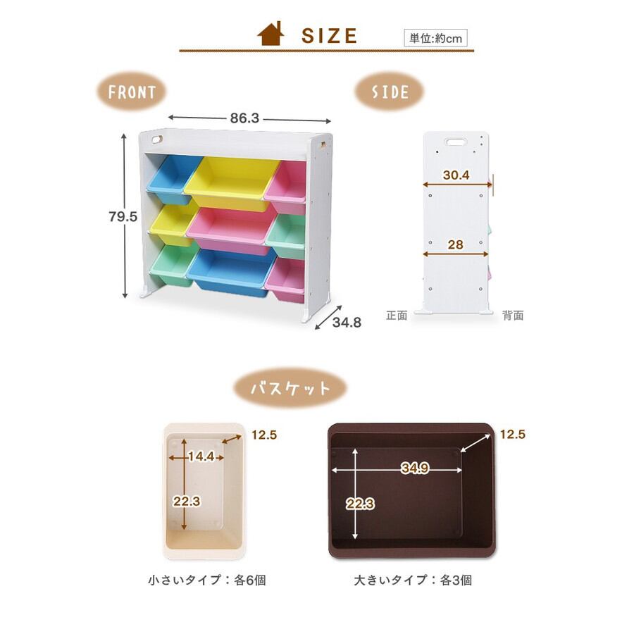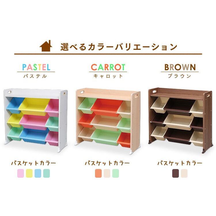 色分けされていることで「どこに何を片づける」のルールが決めやすく、お子様の自立心をサポートし楽しくお片付けができる収納用品です。