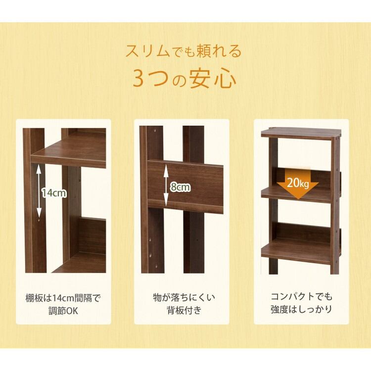 置く物に合わせて約14cm間隔で棚板の位置が調整可能です。