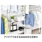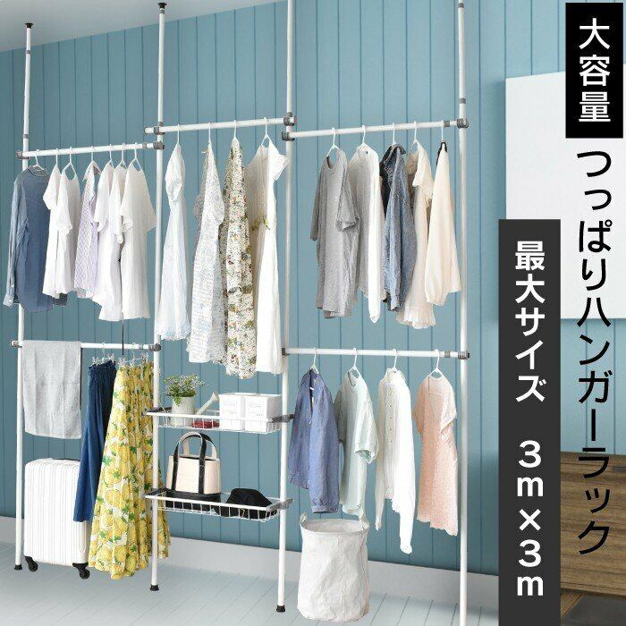 【大特価】つっぱり ラック 突っ張りラック ハンガーラック 縦4本横4本 2段バスケット付 突っ張り ウォールラック 壁面収納