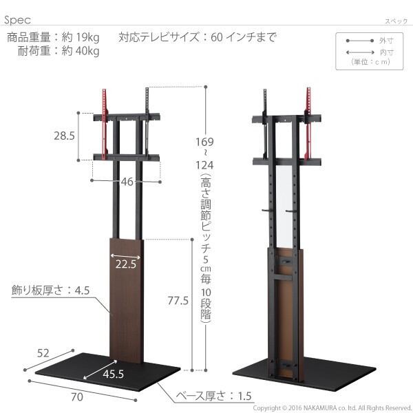 TV取付ネジ穴高さ(最大時/最小時):168/123cm